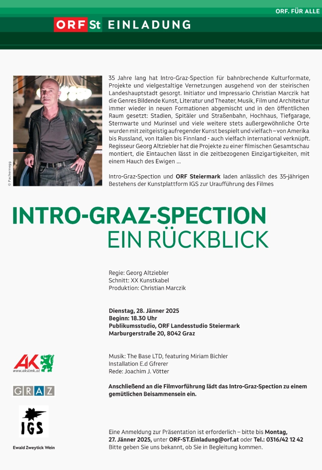 Pressetext: „35 Jahre lang hat Intro-Graz-Spection für bahnbrechende Kulturformate, Projekte und vielgestaltige Vernetzungen ausgehend von der steirischen Landeshauptstadt gesorgt. Initiator und Impressario Christian Marczik hat die Genres Bildende Kunst, Literatur und Theater, Musik, Film und Architektur immer wieder in neuen Formationen abgemischt und in den öffentlichen Raum gesetzt: Stadien, Spitäler und Straßenbahn, Hochhaus, Tiefgarage, Sternwarte und Murinsel und viele weitere stets außergewöhnliche Orte wurden mit zeitgeistig aufregender Kunst bespielt und vielfach – von Amerika bis Russland, von Italien bis Finnland – auch vielfach international verknüpft. Regisseur Georg Altziebler hat die Projekte zu einer filmischen Gesamtschau montiert, die Eintauchen lässt in die zeitbezogenen Einzigartigkeiten, mit einem Hauch des Ewigen … Intro-Graz-Spection und ORF Steiermark laden anlässlich des 35-jährigen Bestehens der Kunstplattform IGS zur Uraufführung des Filmes INTRO-GRAZ-SPECTION – EIN RÜCKBLICK.“